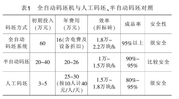 我們來看一組全自動碼坯機與人工碼坯的生產對照見表 1 。