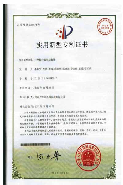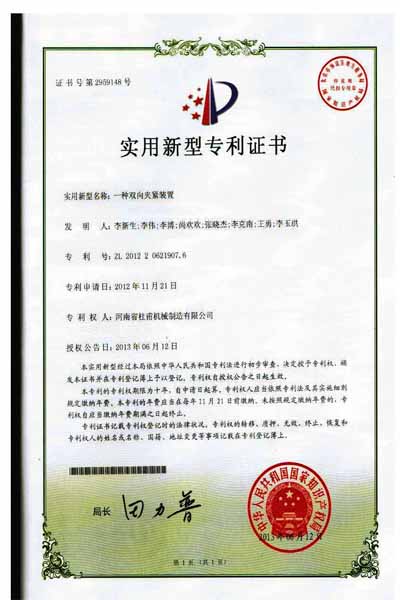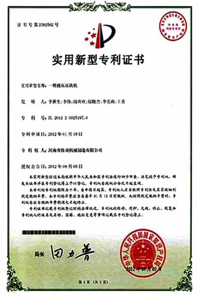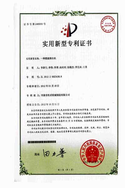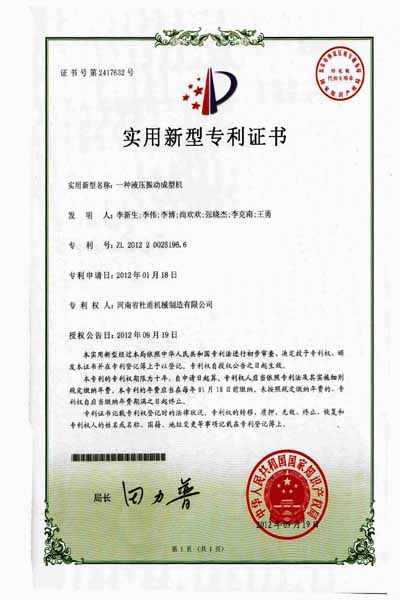 河南省杜甫機(jī)械自1998年開始,投入資金用于新型墻體材料系列設(shè)備的研制和開發(fā)。吸收和借鑒國內(nèi)外成功經(jīng)驗和先進(jìn)技術(shù),成功地開發(fā)了300—1200T全自動免燒磚成套設(shè)備投放市場以來,已為百余家大、中、小新型墻體材料生產(chǎn)企業(yè)提供了較為理想的生產(chǎn)設(shè)備。千錘百煉、百煉成鋼。2012年杜甫機(jī)械為該公司多項產(chǎn)品申請了實用新型專利,于2013年6月12號授權(quán)公告。以下是產(chǎn)品專利授權(quán)書。
