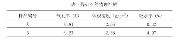 觀察兩種煤矸石外貌特征:A礦的煤矸石屬于巷道矸石;B礦的煤矸石屬于過火矸石。其 物理性質見表1.由表1知,A礦煤矸石氣孔率低、體積密度小大、吸水率小。可見,A礦煤矸石的致密度相對較高。