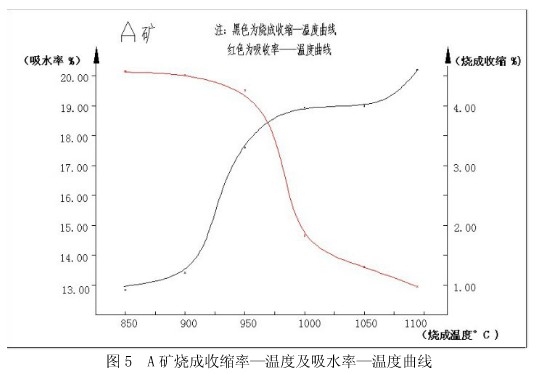 將 A 、B兩礦煤矸原料,經人工破碎,全部經過1mm篩,混合均勻后,以備后期各項測試使用。采用煤矸石真空磚機擠出成型,該磚機出口尺寸50.0 mm:x 25.0mm。以小型試塊[ 50 x 25 x 10 (mm ) ]在高溫梯度爐中焙燒,梯度爐焙燒后的小試塊進行燒成收縮率和吸水率測定,以確定該混合料的擠燒溫度范圍及更佳燒成溫度。燒成收縮率一溫度及吸水率一溫度曲線,見下圖 5 ,圖 6 。