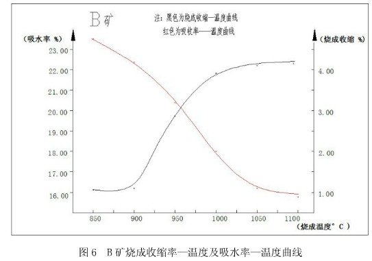 由圖 4 和圖 5 可以看出,隨著燒結溫度的升高,制品的吸水率呈下降趨勢,燒成收縮率呈上升趨勢,到達燒結溫度時,制品的吸水率與燒成收縮率都達到平穩值。 A礦在950℃~ 1000℃ 之間發生燒結,制品變的致密;B礦在1000℃~1050℃之間發生燒結,制品變的致密。一般制磚原料的燒成線收縮率控制在2一5%。由此可知,A礦和B礦原料燒成線收縮率符合制磚要求。由此可知煤矸石是可以制磚的。