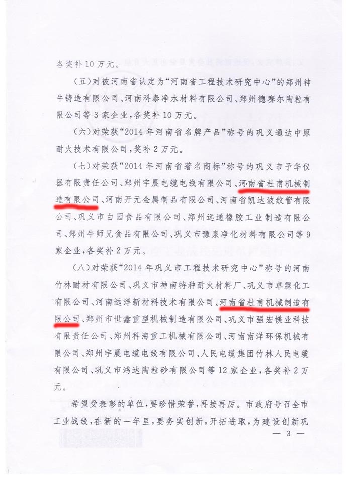 對包括我公司-河南省杜甫機械制造有限公司在內的9家榮獲“2014年河南省著名商標”稱號的企業各獎補2萬元。