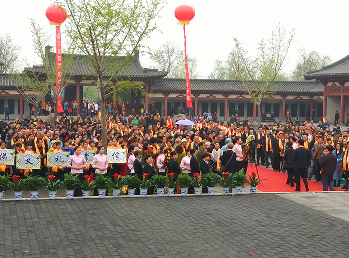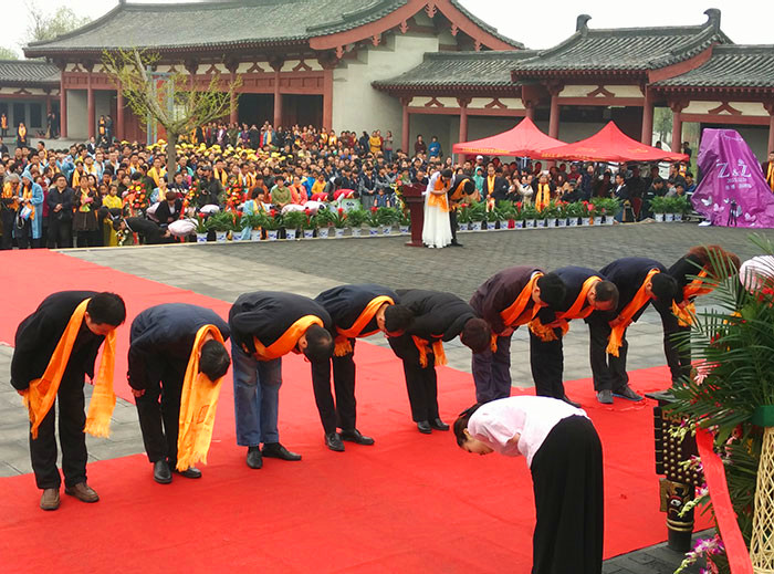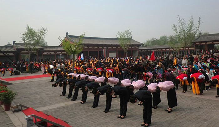 鞏義籍、原國務院副總理吳桂賢宣布祭典開始,主祭人神情肅穆,儀態莊重的分別完成了凈手、奠帛、誦讀祭文等環節,童聲誦讀的祭文,余音裊裊,猶如天籟,磬入心脾;隨后,朝圣隊伍和各界群眾在音樂的伴奏下向詩人堂三鞠躬,以此告慰詩人在天之靈。