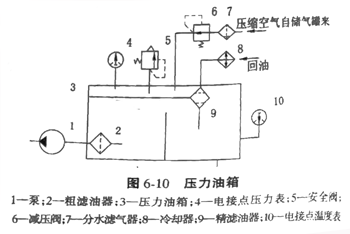 當泵吸油能力差、安裝補油泵不合算時,可采用壓力油箱,如圖6-10。將油箱封閉,來自壓縮空氣站儲氣罐的壓縮空氣經減壓閥將壓力降到0.05~0.07MPa,為防止壓力過高,設有安全閥5。為避免壓力不足,還設有電接點壓力表4和報警器。