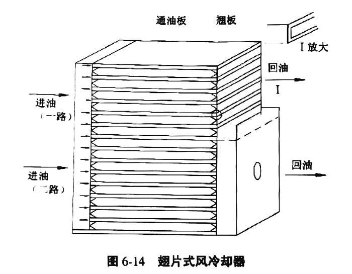 圖6-12為翅片式水冷卻器,水從管內流過,油液在水管外面通過,油管外部加裝橫向或縱向散熱翅片,以增加散熱面積,其冷卻效果比其他冷卻器提高數倍。