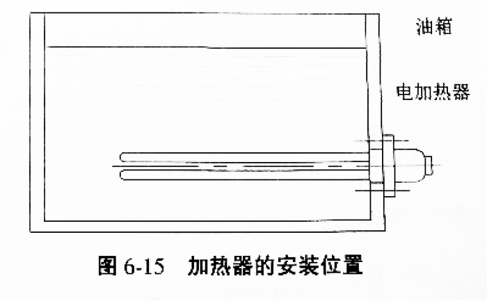 液壓系統的加熱一般常采用結構簡單、能按需要自動調節最高和最低溫度的電加熱器。這種加熱器的安裝方式如圖6-15,它用法蘭盤橫裝在箱壁上,發熱部分全部浸在油液內。加熱器應安裝在箱內液壓油流動處,以利于熱量交換。由于油液是熱的不良導體,單個加熱器的功率容量不能太大,以免周圍液壓油過度受熱后發生變質現象。